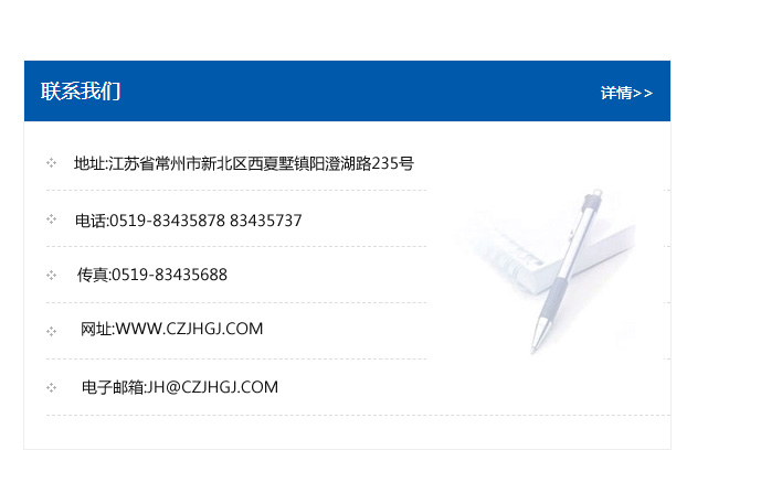 地址:常州市新北區友邦商務大廈1幢16、17層  電話:0519-85101652  傳真:0519-85112595  郵編:213022  網址:www.cz-jiayue_cn.tjjhjz.com  郵箱:xiajifengaa@163.com